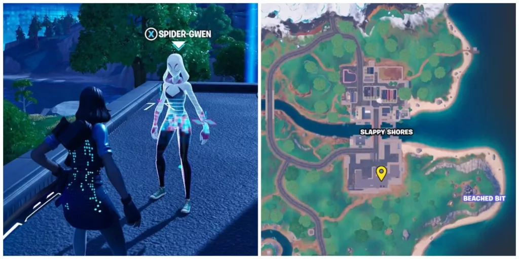 It is a common misconception that Spider-Gwen enjoys exploring Mega City’s skyscrapers and other tall structures; however, this is not the truth. Players will need to travel to Slappy Shores, which is located in the eastern portion of the map, in order to locate Spider-Gwen. Climbing the factory in the southeast corner of the site will bring players to where she is hiding.