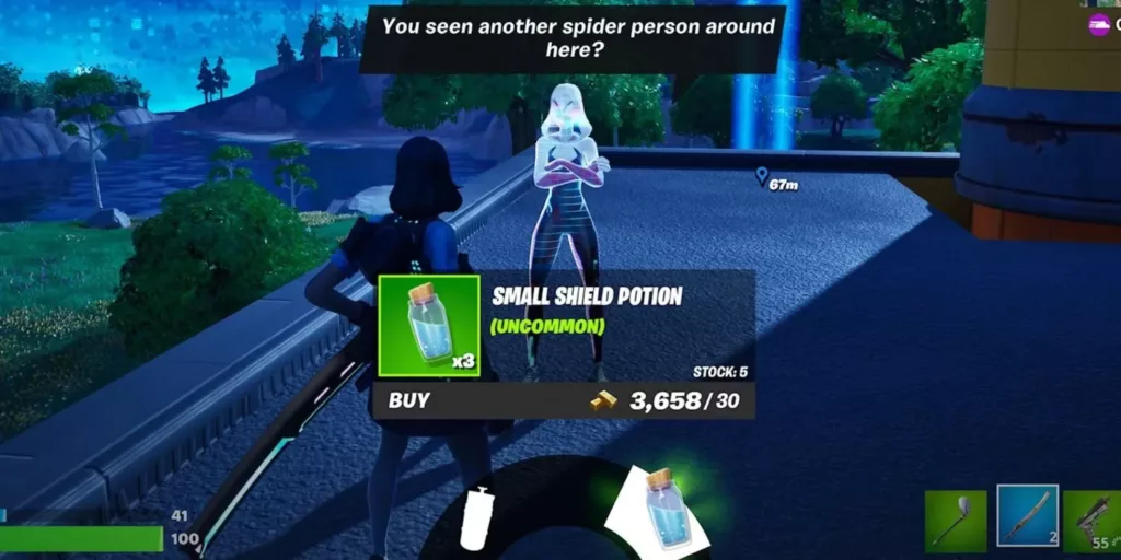 Gwen, like other non-playable characters in Fortnite, will trade players gold for a select set of goods. Small Shield Potions may be purchased from Spider-Gwen for 30 gold bars, while Shield Kegs can be purchased for 250 gold bars.